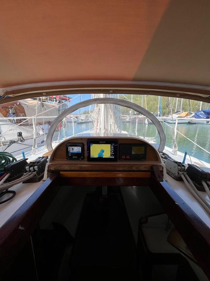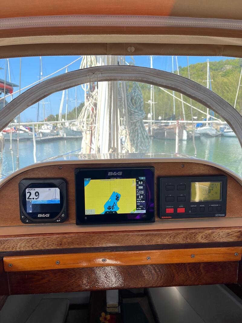 B& G touch screen color Chartplotter 7". B& G Multi data with Maretron Mast wind sensor & Depth/speed/temp transducer. Furuno Chartplotter 12" Radar RD149 as secondary backup. Raymarine 12V Type 300 with hydraulic actuator. Vesper XB800 AIS with Wifi, Digital Converter 0183, NMEA2000 network. VHF Radio with Digital Select Calling. Monitor Wind Vane available (not installed).