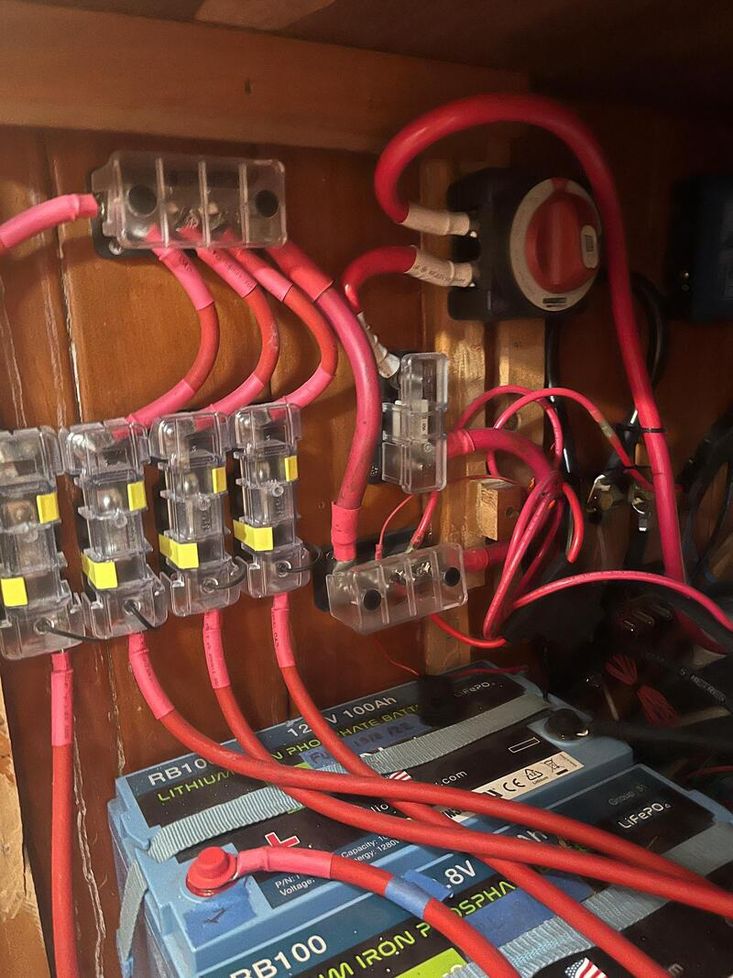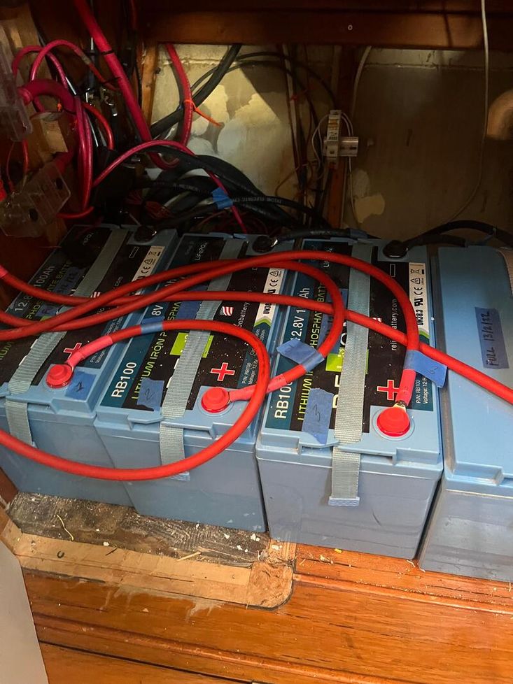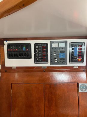 Engine: 1 x Starter Battery 800CC Sealed lead acid installed 2024. Windlass Winch: 1 x 850CC battery sealed lead acid battery installed 2024. House: 4 x 100AH Relion LifePO4 lithium installed 2025. Victron Solar charger controller 30A. Victron Battery monitor BMV712. Victron Alternator Battery charger splitter. Alternator charge protection module. Full electrical rewire and 12V panels ABYC standards done 2025. Cotek 1000W Pure Sin wave inverter. 530 Watts solar panels installed 2018 on full aft aluminum double arch. Mast sailing Tricolore LED replaced 2026. Deck & Steaming light LED replaced 2026. Port/Stbd/Aft Navs LED lights. All interior lights are LED, replaced 2025.