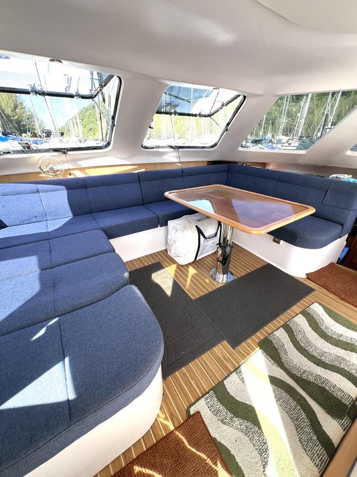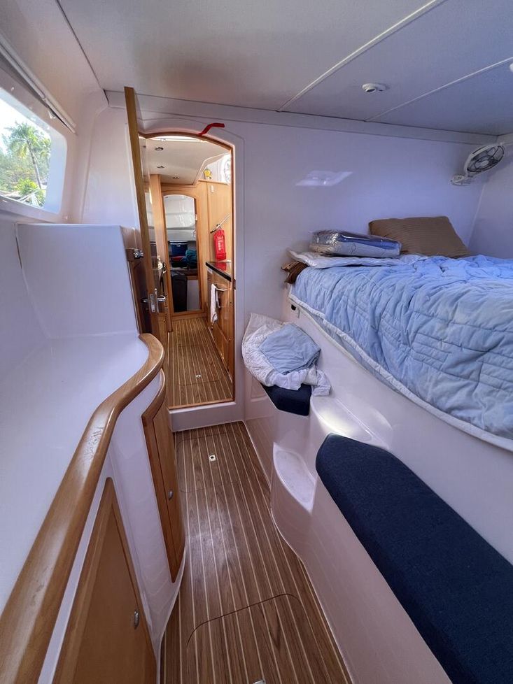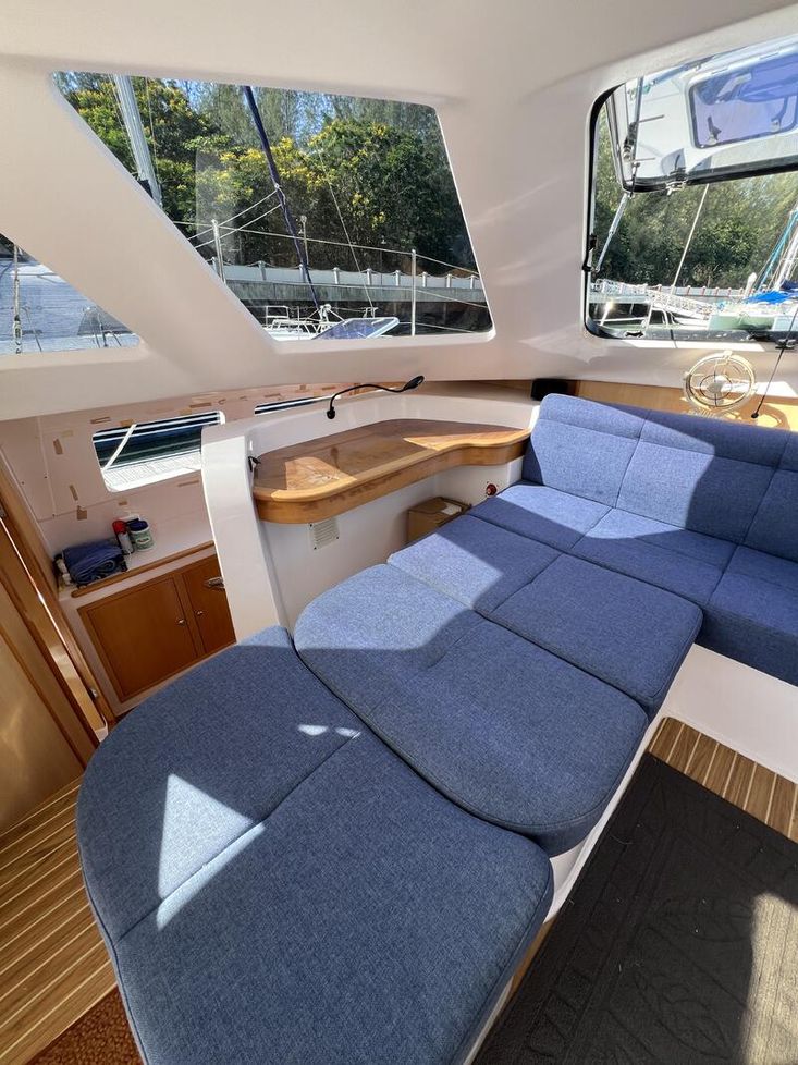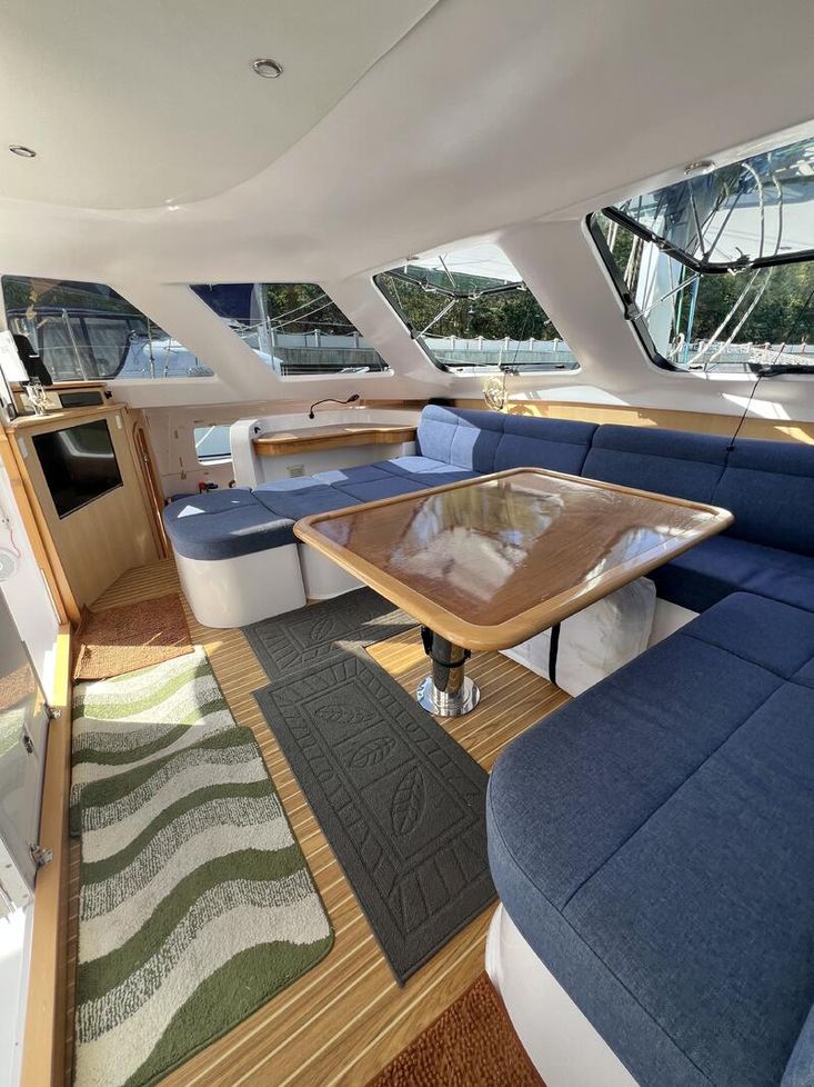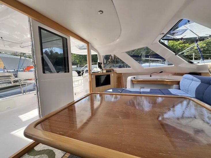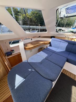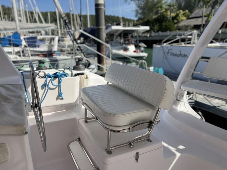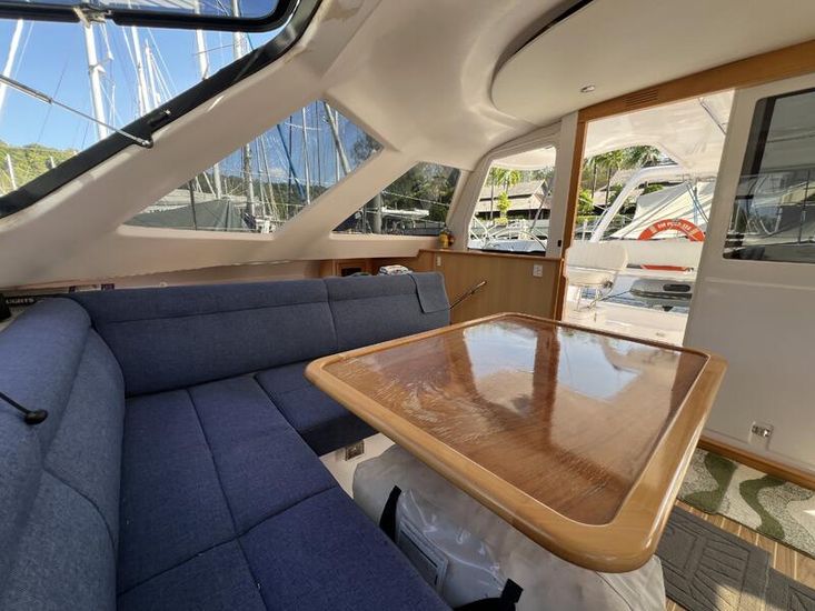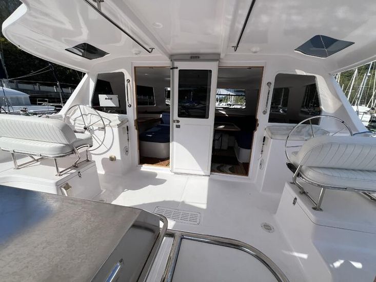 The Seawind 1250 is renowned among experienced cruisers for striking that sweet spot between performance and comfort. She sails beautifully in light airs yet remains composed when the breeze fills in. The protected helm positions are a standout feature--especially in tropical downpours or tropical sun--and the open-plan saloon with those signature tri-folding doors creates a seamless indoor-outdoor living space that's perfect for the region. With a beam of 6.8m and a modest 1.2m draft, she'll slip into those shallow anchorages where bigger cats can't go.